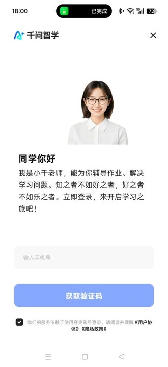 使用千问智学需先登录,用户首次使用时通过手机号码完成快速验证即可进入。