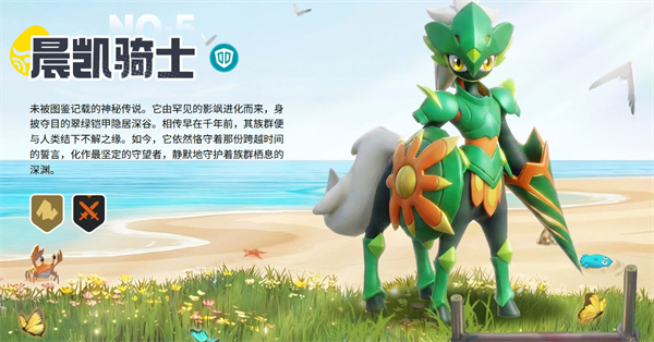 未被图鉴记载的神秘传说。它由罕见的影飒进化而来,身披夺目的翠绿铠甲隐居深谷。