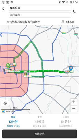 4、设置完毕途径点,对重新规划的路线进行确认,可以看到新的路线绕开了限行区。这里需要解释一下高架桥的绕行问题,由于高德的规则限制,部分高架桥无法主动避开,包括环路。所以需要摩友额外注意;