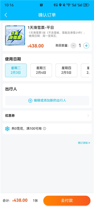 5、选择购票数量、使用日期和出行人,完成后进行付款即可完成预订流程。