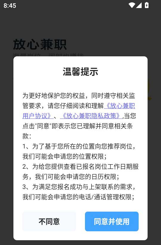 1.首先打开软件阅读“温馨提示”后,点击“同意并使用”按钮进入APP