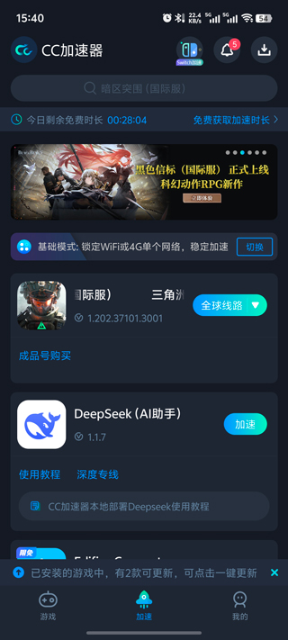 1、首先在本站下载安装三角洲行动国际服最新版,安装完成后打开手游加速器(如CC加速器、奇游手游加速器),找到这个游戏,点击加速;