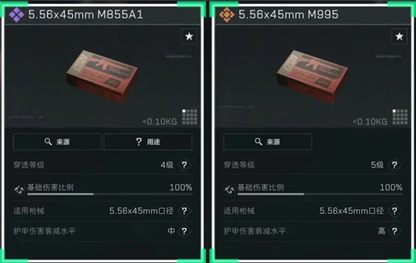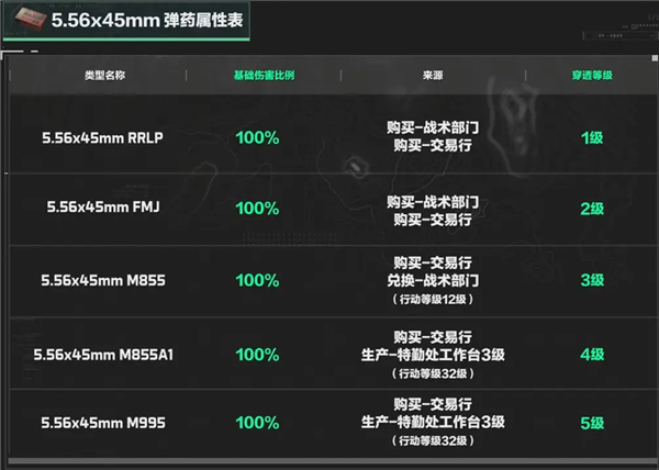 5.56x45mm口径各个型号弹药目前基础伤害比例均为100%,共有从1级到5级,合计5个穿透等级。