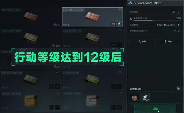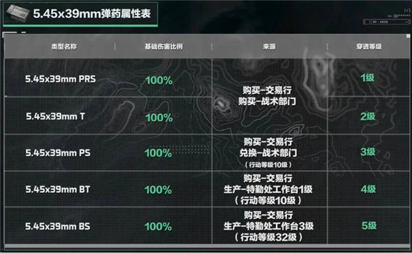 其中前2种型号弹药可在战术部门或交易行中购买,后3种型号弹药主要在交易行中购买、特勤处制造或者对局内搜索直接获得,其中M855型号的弹药在行动等级达到12级后,可以在战术部门兑换获取。