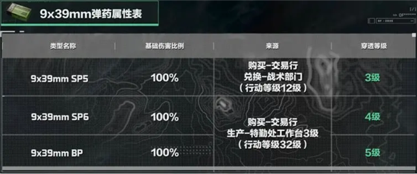 9x39mm SP5是3级弹,可在交易行购买,行动等级达到12级时也可以在战术部门进行兑换。9x39mm SP6和9x39mm BP分别是4级弹和5级弹,既可以在交易行购买,同时也可以通过生产来获取。