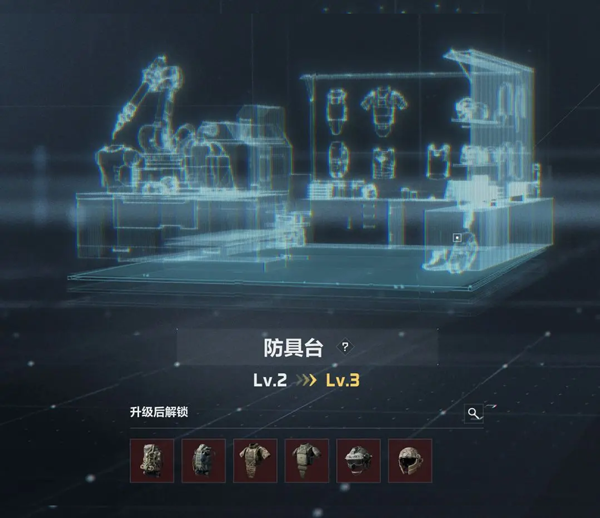 在防具台,干员们可以选择生产图纸,使用指定的材料生产高级防具,背包等,升级防具台,可以解锁更多物资。