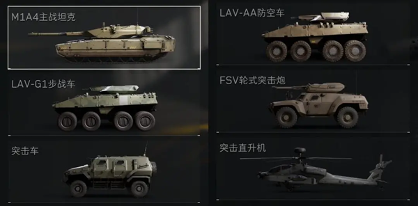 目前可改装的战斗载具共有6种类型。分别是M1A4主战坦克、LAV-G1步战车、突击车、LAV-AA防空车、FSV轮式突击炮、突击直升机。