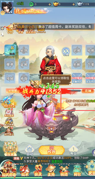 3、玩家前期可以通过屏幕右侧的指导任务逐渐提升战力。