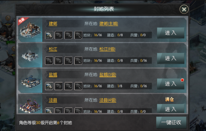 农场,木厂,铜矿建筑等级越高产量与储存上线越高,兵营需要升级才能招募到更高级的兵力,封地是在世界上面的城池上面封的,城池等级越高对封地建筑的提升越高。封地每五级开启一个新的封地。