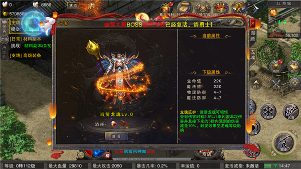 [龙魂系统] 龙魂可以提升大量生命 防御属性,激活之后还可以领悟龙魂庇护受到伤害会免疫一次攻击并获得伤害减免,绝对是pk抢宝的利器。龙魂密室击杀小怪和boss均有几率掉出龙魂晶石。