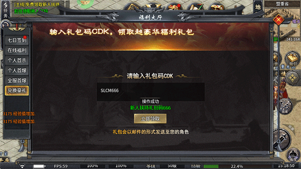 5、在福利大厅点击兑换豪礼,输入SLCM666还可以获得新人扶持礼包;