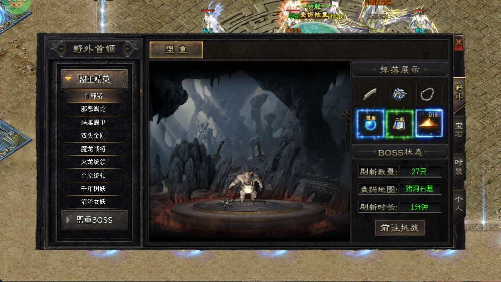 挑战盟重精英、盟重BOOS等内的首领,获取高价值装备,替换初始装提升战力。