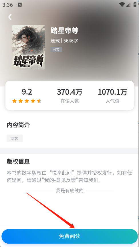 3、用户点开想看的小说进入详情页,点击免费阅读。