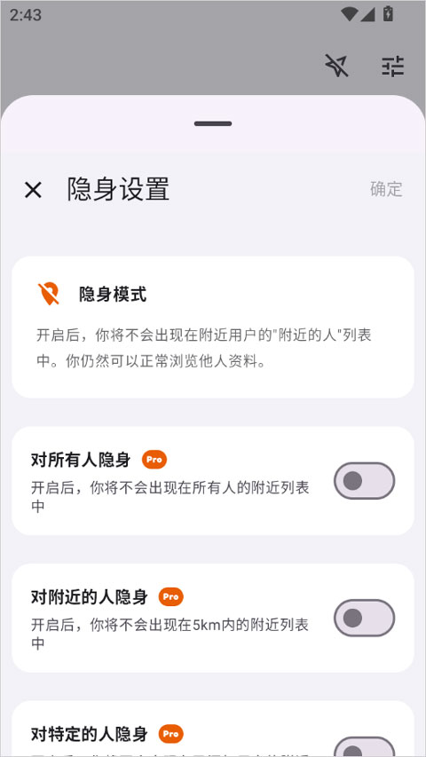 5、还有隐身模式,你可以开启并由你决定如何被看见。
