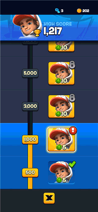6、跑酷分数越高就能获得更多的升级奖励,每个角色都有着技能系统。比如杰克一阶段技能位获得一个磁铁,二阶段捨取金币就能为滑板充能,三阶段开始游戏就可以获得一块滑板。