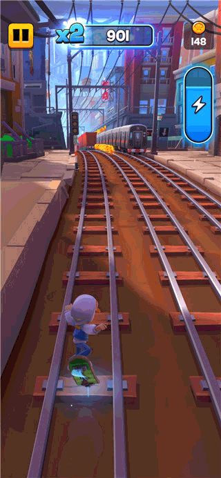 滑板激活与无敌机制:跑酷过程中收集电池能量,集满后双击屏幕即可激活滑板,进入短暂无敌状态,可冲破障碍、无视抓捕,右上角能量条耗尽后效果消失。