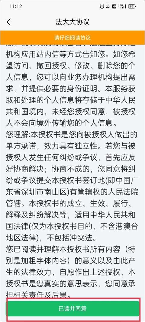 2、仔细阅读法大大的协议,阅读完之后点击下方的“已读并同意”按钮。