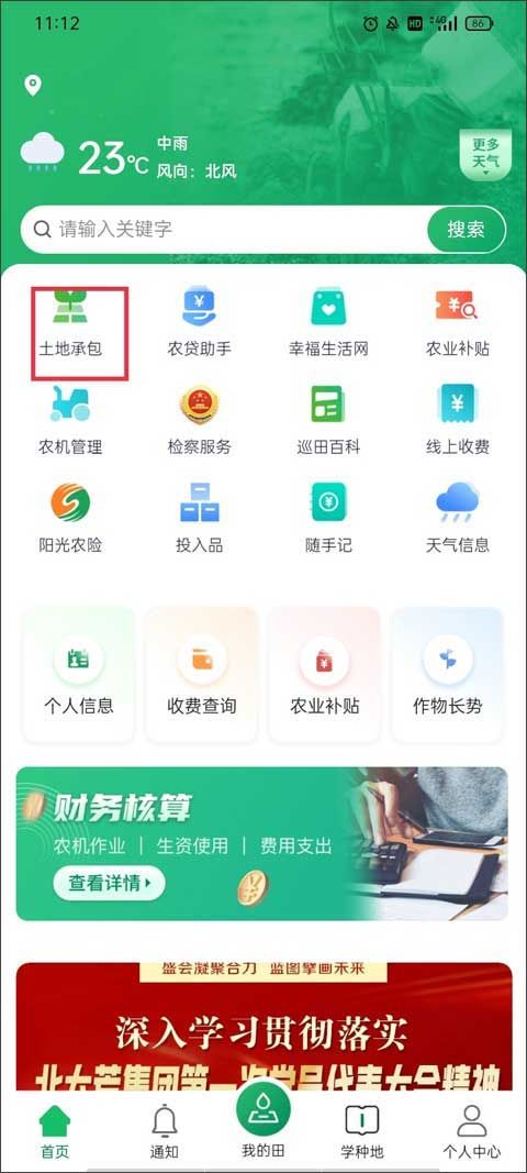 1、打开app并默认进入到【首页】,在上方有很多的功能选项,点击上方的“土地承包”功能。