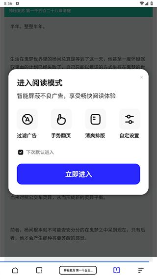 3、功能也非常的简单,可以过滤大量的广告,还可以和其他小说阅读软件一样设置字体,这里点击立即进入。