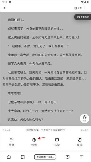 1、进入到小说阅读界面,点击设置。