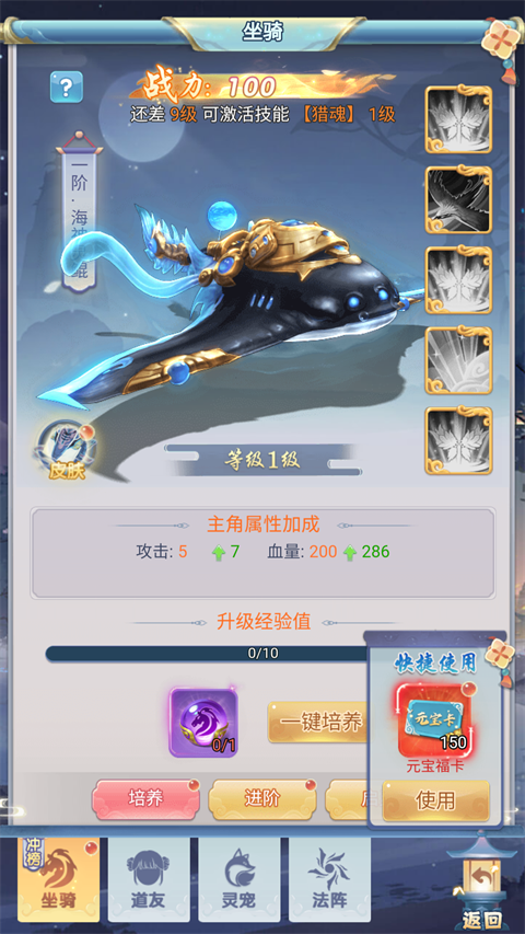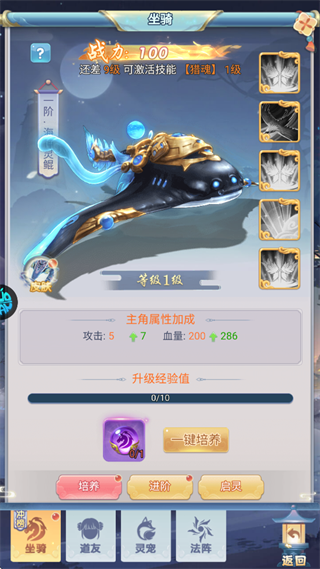 培养坐骑通过升级增加主角属性加成来提升战力。