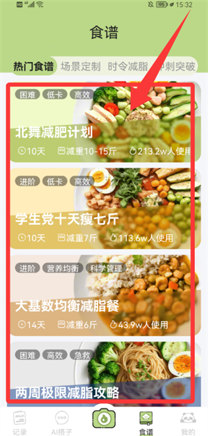 3、在食谱页浏览减脂计划列表,查看饮食详情。