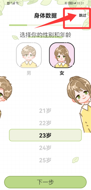 2、在身体数据页可填写或跳过,进入主界面。