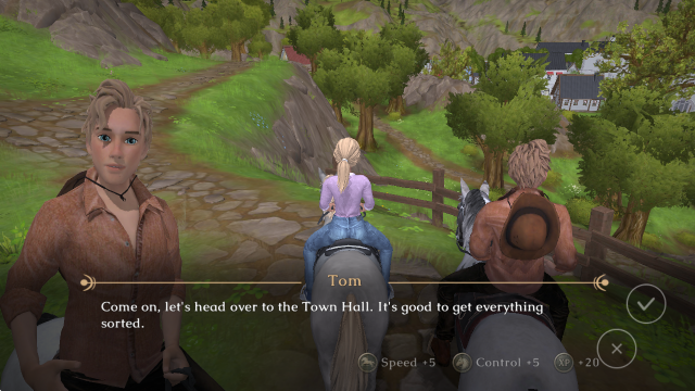 拟真骑马操控系统:摒弃传统的虚拟摇杆,采用更符合直觉的触控操作——拖动屏幕控制移动方向,点击右侧按钮执行跳跃等指令,并需实时调整速度以防马匹受惊失控。