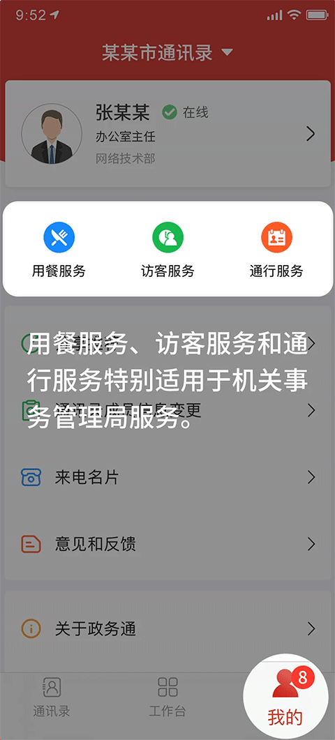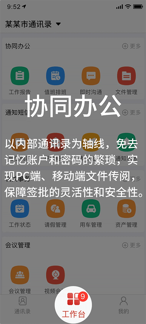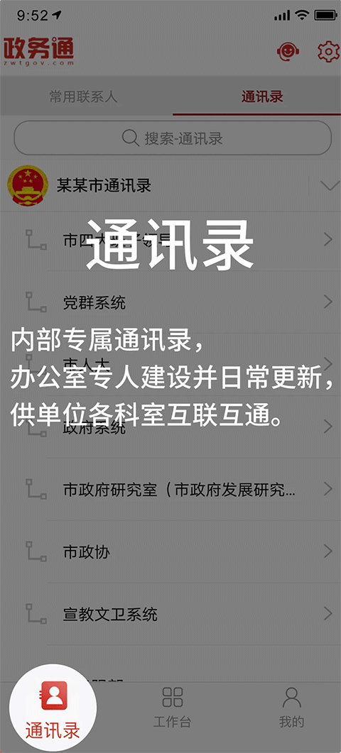 政务通---党政机关内部办公专属应用,以内部通讯录管理和公文流转为特色功能,兼顾会议通知、跨平台短信、用车管理、用餐管理等多种功能。