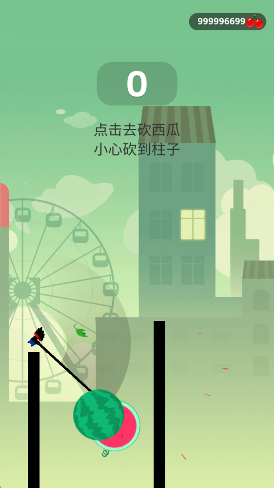 5、点击屏幕后就会挥出,将面前的西瓜劈开即可跳到下一个地点。
