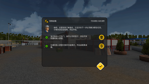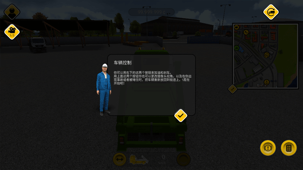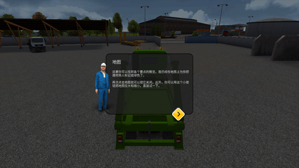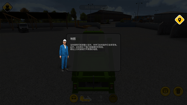 当你使用可拆卸翻斗车时,你学习如何操作它就非常快。用右上方的按钮打开周围的地图。这里你可以找到各个要点的概览,地图上建材商人标记成绿色了。再次点击地图就可以把它关闭。此外,你可以用这个小按钮把地图拉天和缩小。直接试一下。
