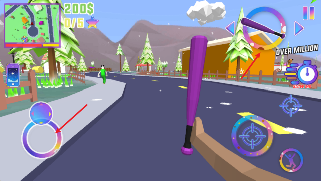 1、游戏中通过左侧的摇杆控制移动,点击右上角的武器即可切换。