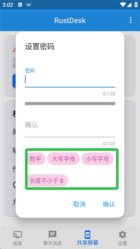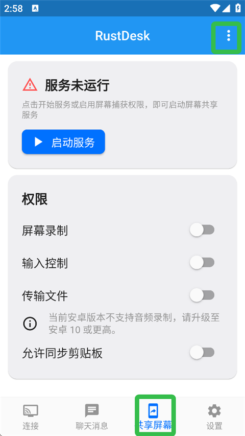 1、打开RustDesk,进入【共享屏幕】页面,点击三点标识。
