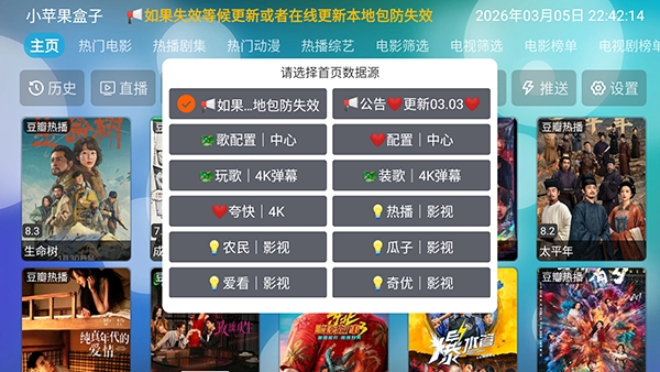 4、点击首页选项,可以切换首页影视源。