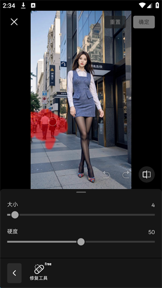 4、根据需求,调整“大小”以及“硬度”参数,随后在照片上涂抹需要消除的人物即可。