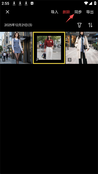 4、在选择一张已经完成修图的样本,其余的照片都会按照该样本进行批量修图,再点击屏幕右上方的“同步”。