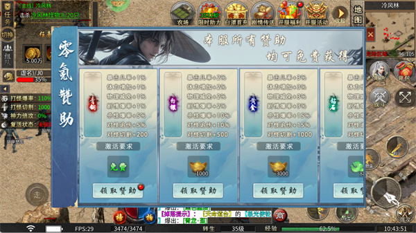 游戏提供青铜赞助免费激活,白银和黄金赞助可通过元宝解锁。这些赞助可以提高打怪爆率和切割属性,帮助你更高效地获得资源。