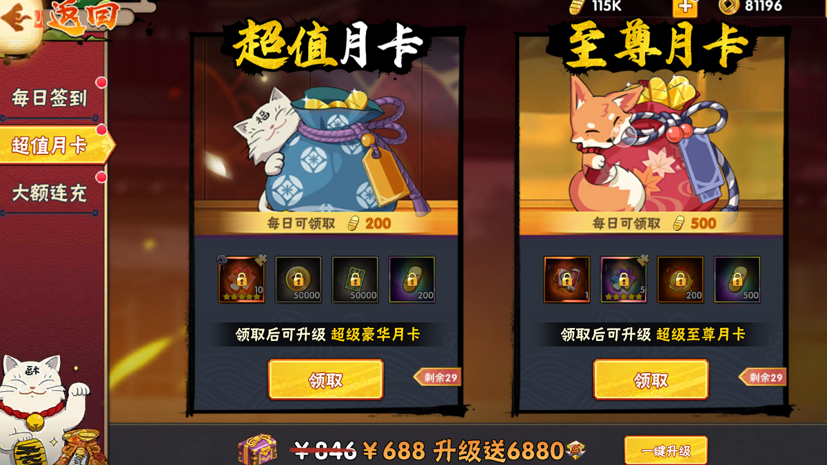 月卡性价比超高,累计充值就可获取,获取VIP特权额外加成、获取更多培养材料,快人一步。