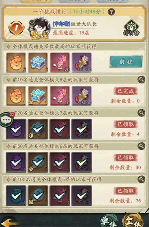 全体斩将,由于大佬有点多,只能打拿到第七层奖励,其实第八层的也能拿到,就是差一个大佬的武将,当时一觉醒来就只剩一个位置了,天都塌了,怎么我这区这么热闹,按以往说,还剩一半的位置,难道这游戏好起来了?