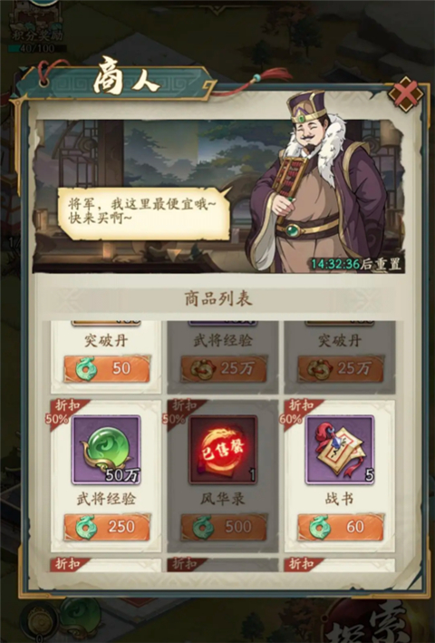 说一下行脚商,前期我们的不会缺,能用金币买的全部都搜刮干净,进阶丹,经验和战书,等到了中期,经验可以不用买,进阶丹继续,进阶丹是一直都会缺的。另外骰子我会花玉买次数。