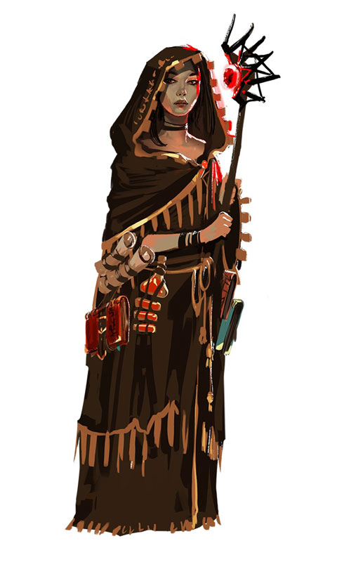 善于使用魔法进行中距离攻击的角色,具有1的护甲(显示在角色右上角),等级初始为1(显示在角色左上角),角色身边的方框表示角色目前的装备,右边的方框代表库存的装备,库存装备下方是库存道具。光标移到装备上可以查看装备信息。
