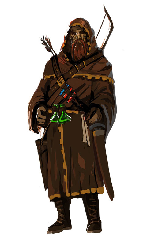 善于使用弓进行远程攻击的角色,具有1的护甲(显示在角色右上角),等级初始为1(显示在角色左上角),角色身边的方框表示角色目前的装备,右边的方框代表库存的装备,库存装备下方是库存道具。光标移到装备上可以查看装备信息。
