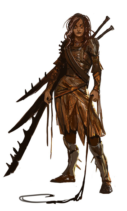 善于使用剑进行近战攻击的角色,具有2的护甲(显示在角色右上角),等级初始为1(显示在角色左上角),角色身边的方框表示角色目前的装备,右边的方框代表库存的装备,库存装备下方是库存道具。光标移到装备上可以查看装备信息。