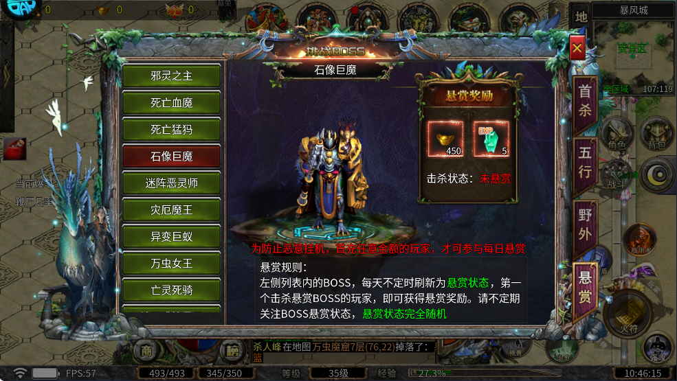 完成首杀可以自动获得元宝x450以及初级经验矿x5