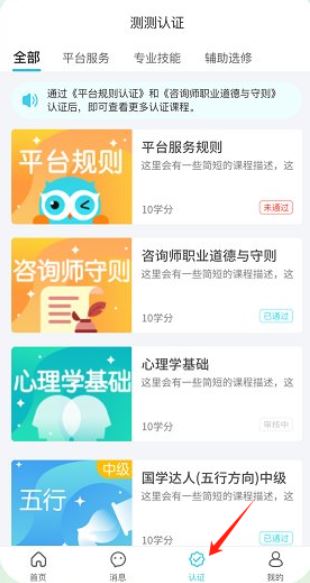 3、点击认证页含平台服务等类别认证,像平台规则、咨询师守则等课程,显示认证进度。