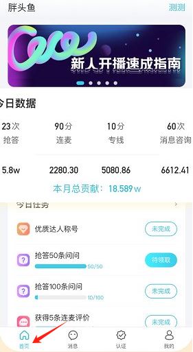 1、点击首页显示胖头鱼今日数据,如抢答23次等,还有本月总贡献,列有多项今日任务。