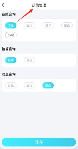 2、点击技能管理页分在线、抢答、消息咨询板块,可勾选沙盘、星盘等技能,能保存设置。