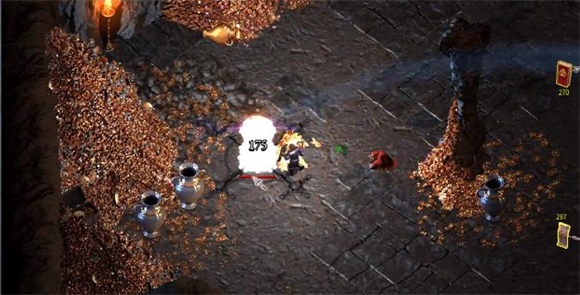 3、进入宝库需要消耗金币,而且会携带一个debuff,进入后先选择巨龙吐息技能,这个技能可以搭配火焰指环造成燃烧,然后沿着道路走去打破四个机关。