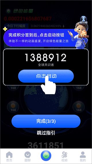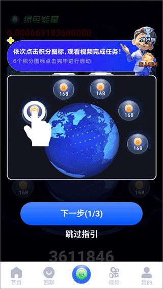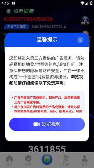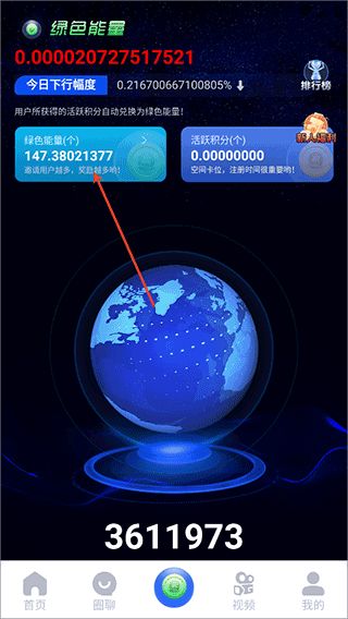1、一个圈圈app就是通过看商家广告,以及拉新等方式来进行赚钱的,用户可以进入软件后点击底部中间的绿色能量图标,然后依次点击积分图标,观看视频完成任务。