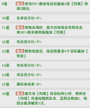 周瑜技能以群伤为主。可以给对方添加铁索以及灼烧效果。对方有灼烧目标死亡时,将所有灼烧传递给随机对方单位。每回合触发一次。